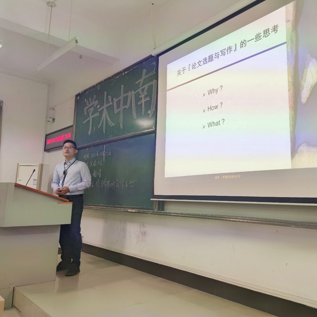 (通訊員:張瀚文 熊保維;攝影:趙雪杰)2020年10月23日晚上7點,學(xué)術(shù)中南第一期:“關(guān)于論文選題和寫作的一些思考”講座在文添樓102成功舉辦。本次講座由偉德體育官網(wǎng)研究生會學(xué)術(shù)部成員熊保維主持,主講嘉賓是現(xiàn)任偉德體育官網(wǎng)研究生導(dǎo)師謝靖。