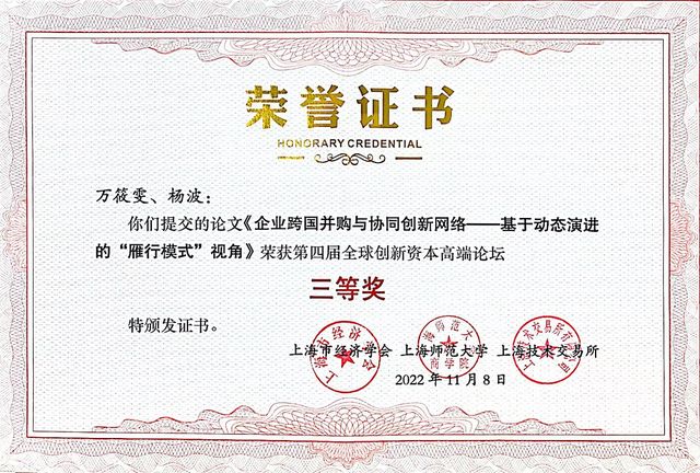 本次會議經(jīng)匿名評審共評選出六篇優(yōu)秀論文,獲獎?wù)撐姆謩e來自上海財經(jīng)大學(xué)、南開大學(xué)、復(fù)旦大學(xué)等高校,其中博士生萬筱雯合作撰寫的論文榮獲三等獎。會議組織單位上海市經(jīng)濟(jì)學(xué)會、上海師范大學(xué)與上海技術(shù)交易所為獲獎?wù)哳C發(fā)了證書和獎金。