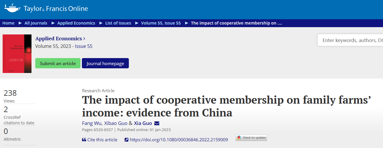 2023年9月,以我院教師郭廈副教授作為通訊作者的合作論文《The impact of cooperative membership on family farms’ income: evidence from China》在經濟學國際知名期刊《Applied Economics》上正式發表。