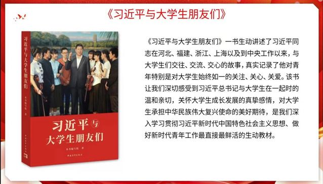 “讀完《習(xí)近平與大學(xué)生朋友們》這本書(shū),我深切地感受到了習(xí)近平總書(shū)記對(duì)大學(xué)生的關(guān)懷以及對(duì)大學(xué)生承擔(dān)中華民族偉大復(fù)興使命的美好期待,這本書(shū)是我們深入學(xué)習(xí)貫徹習(xí)近平新時(shí)代中國(guó)特色社會(huì)主義思想、做好新時(shí)代青年工作鮮活生動(dòng)的教材。”