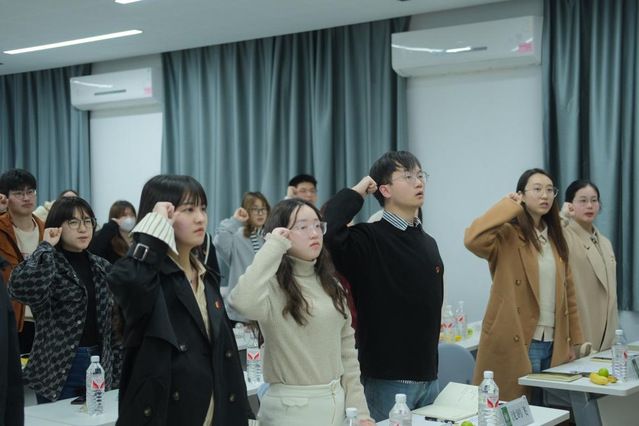 參觀結束后,各支部黨員移步至人文社科樓,共同重溫入黨誓詞。面對鮮艷的黨旗,全體黨員肅立,莊嚴宣誓。