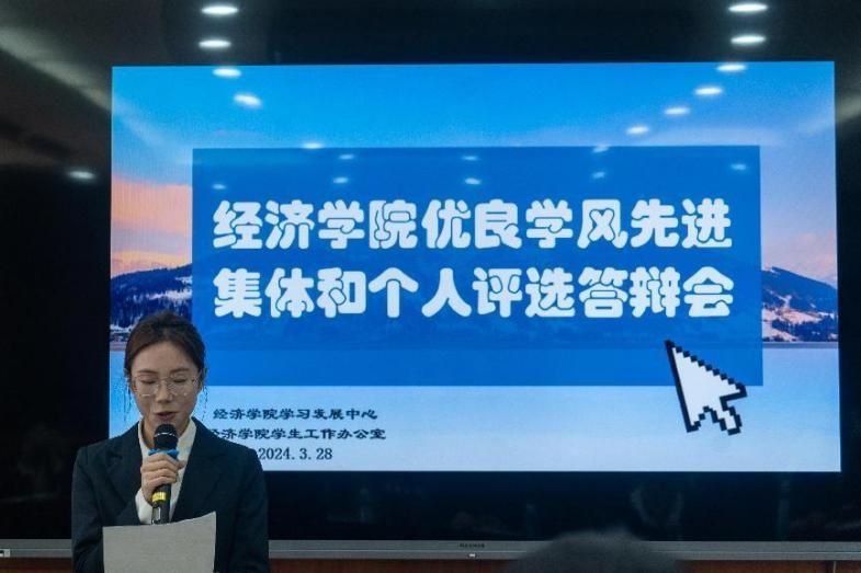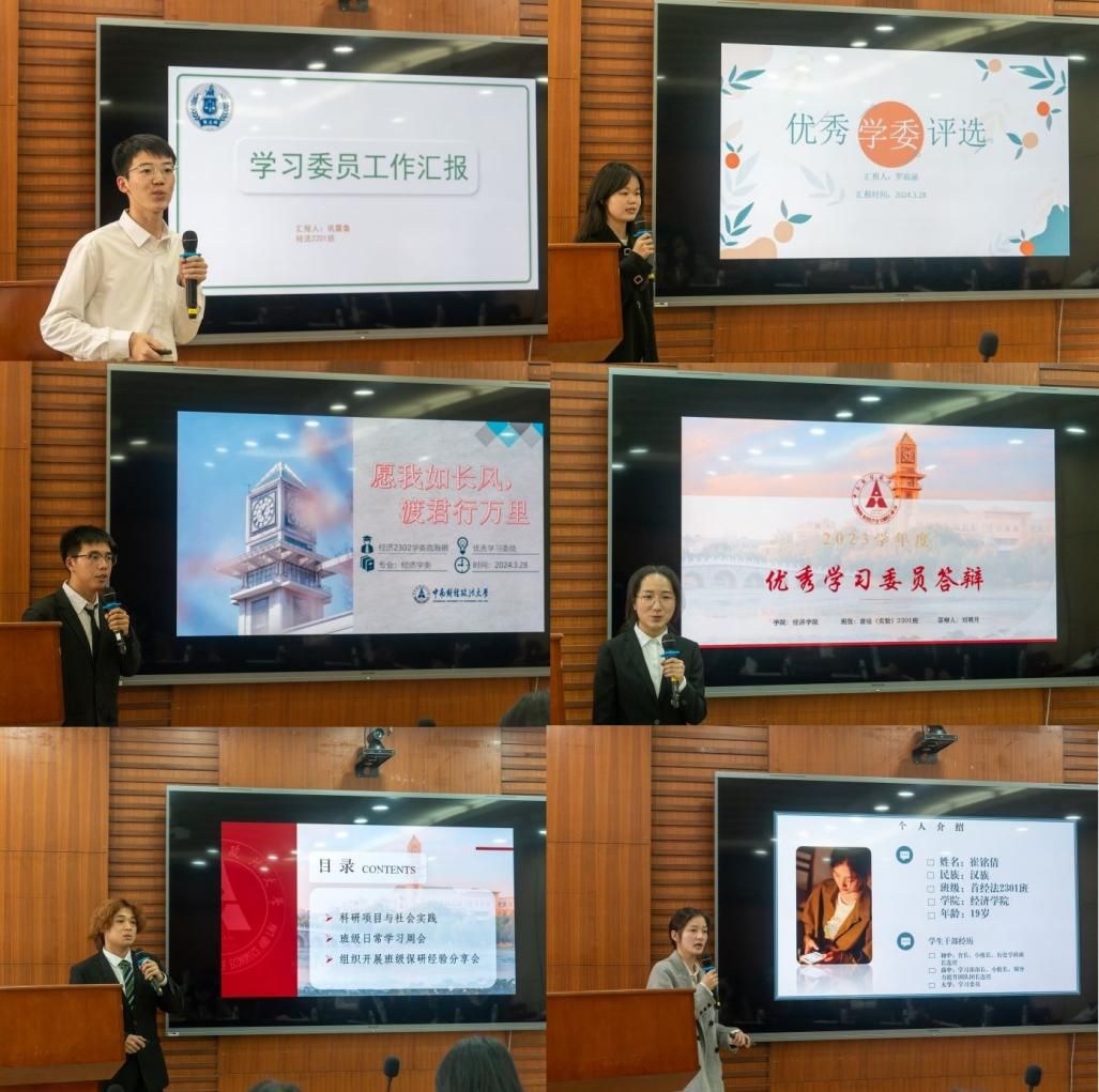 緊接著是“優秀學習委員”進行答辯。其中,經法2201班學習委員鞏震魯回顧了自己一年來的“學委生活”,他以幽默風趣的語言介紹了自己獨特的工作思想以及擔任學委以來帶領班級所取得的優異成績。經濟2303班學習委員羅淑涵從思想道德、學習能力、本職工作三個方面分享了自己擔任學委半年來的心得與成果。經濟2302班學習委員高海祺則從個人經歷、日常工作、總結反思三方面介紹自己的工作,并以生動的語言表達了自己對于學習委員一職的熱愛。