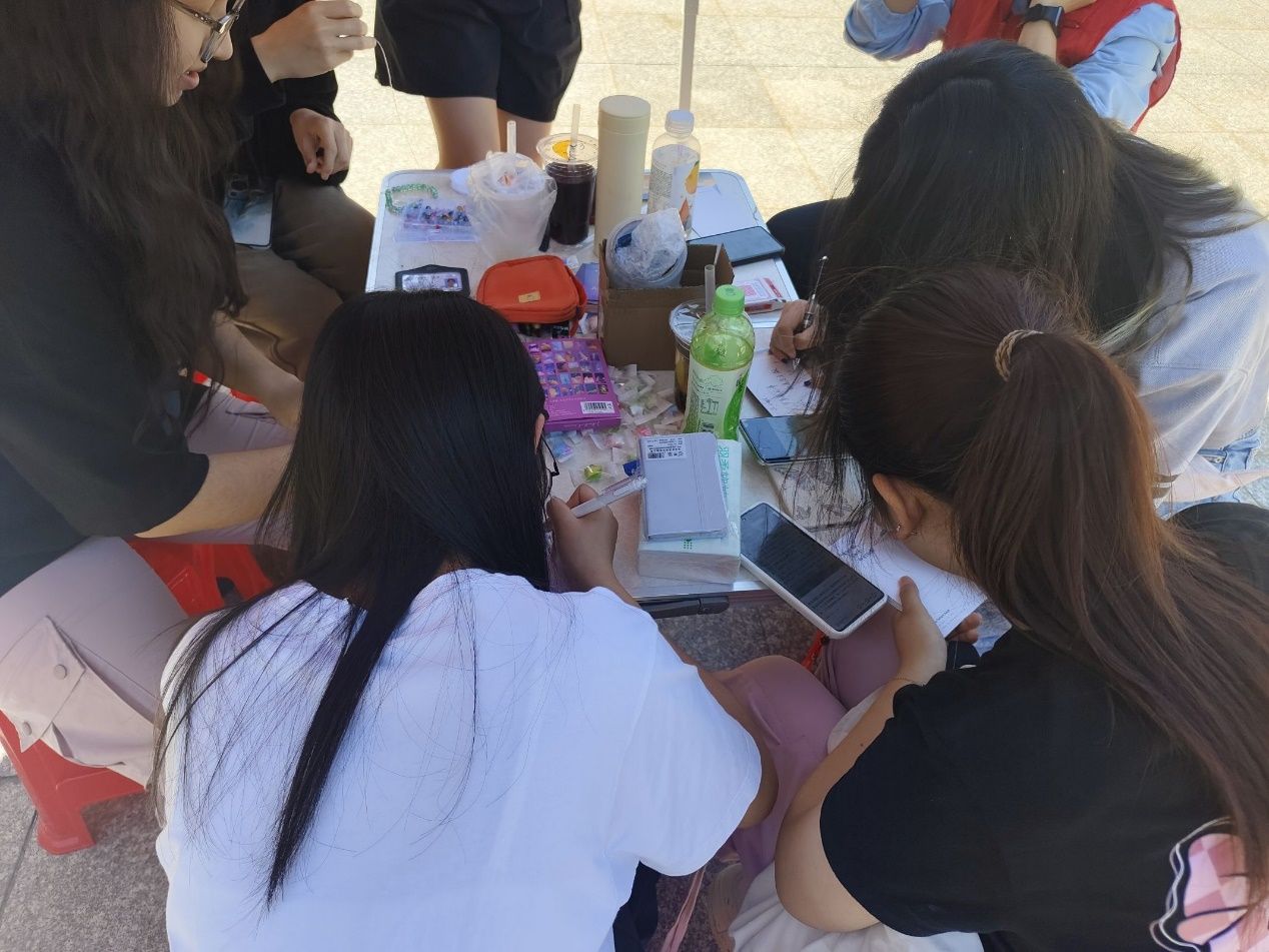 活動尾聲將近,志愿者們開始了最后一個活動——心語串珠。一顆顆晶瑩剔透的珠子,在陽光的照耀下折射暖光。成員們小心翼翼地穿著珠子,圍坐在小桌旁,一串接著一串,留下滿載心意禮物……