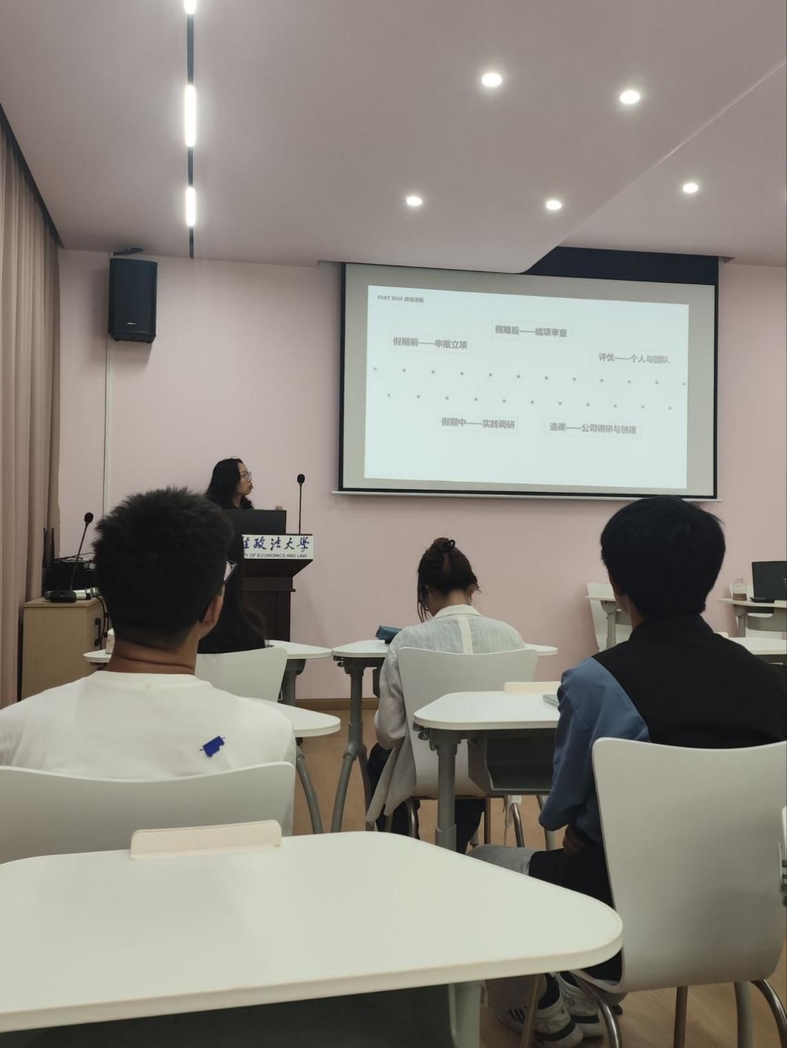 周思妍同學從曾主持的社會實踐項目出發,向大家介紹了“公司調研與創建”類別的社會實踐,并指出其相較于其他類別社會實踐的不同之處。她表示團隊成員的選擇應以能力為先,并且重點強調了團隊成員態度端正的必要性以及項目書格式規范、美觀的重要性。
