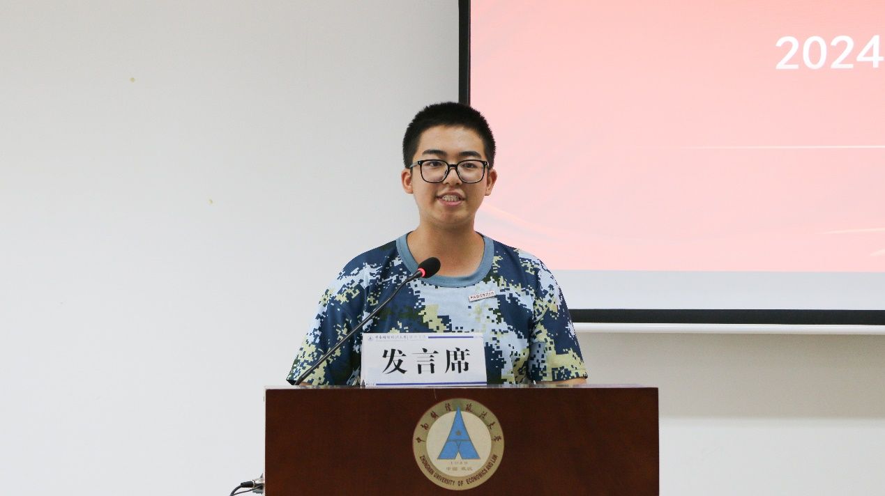 經(jīng)法2401班新生郭迪凡作為新生代表發(fā)言。面對(duì)新的機(jī)遇與挑戰(zhàn),他認(rèn)為,作為一名合格的大學(xué)生,應(yīng)當(dāng)具備強(qiáng)大的時(shí)間觀念,惜時(shí)如金、篤行不怠,將經(jīng)濟(jì)學(xué)相關(guān)知識(shí)活學(xué)活用,融會(huì)貫通。在享受豐富多彩的大學(xué)生活的同時(shí),也要懷著感恩心,不忘來時(shí)路。