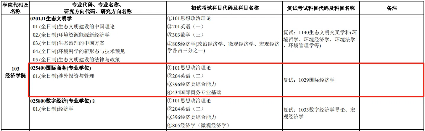 初試科目共4門:(101)思想政治理論(100分)、(204)英語二(100分)、(396)經(jīng)濟(jì)類綜合能力(150分)、(434)國際商務(wù)專業(yè)基礎(chǔ)(150分)。